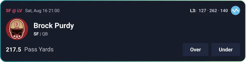 In this scenario, you must decide whether Purdy will pass for more or less than 217.5 yards during the game (i.e. picking between ranges of 0-217 or 218 and greater).