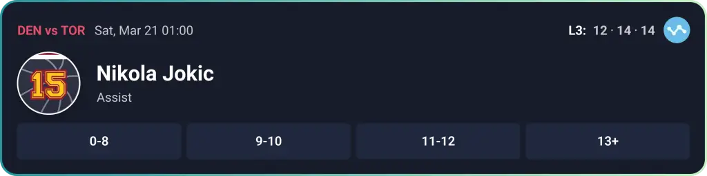 Rather than choosing over or under, you must determine which range Jokic’s final assist total will land in.